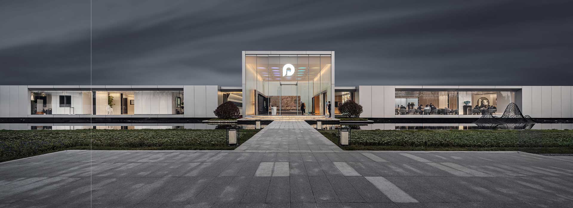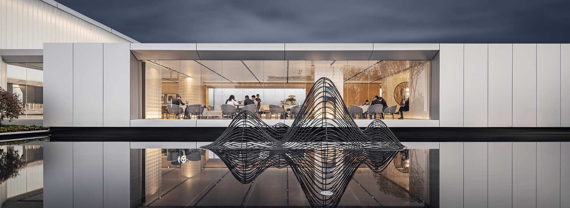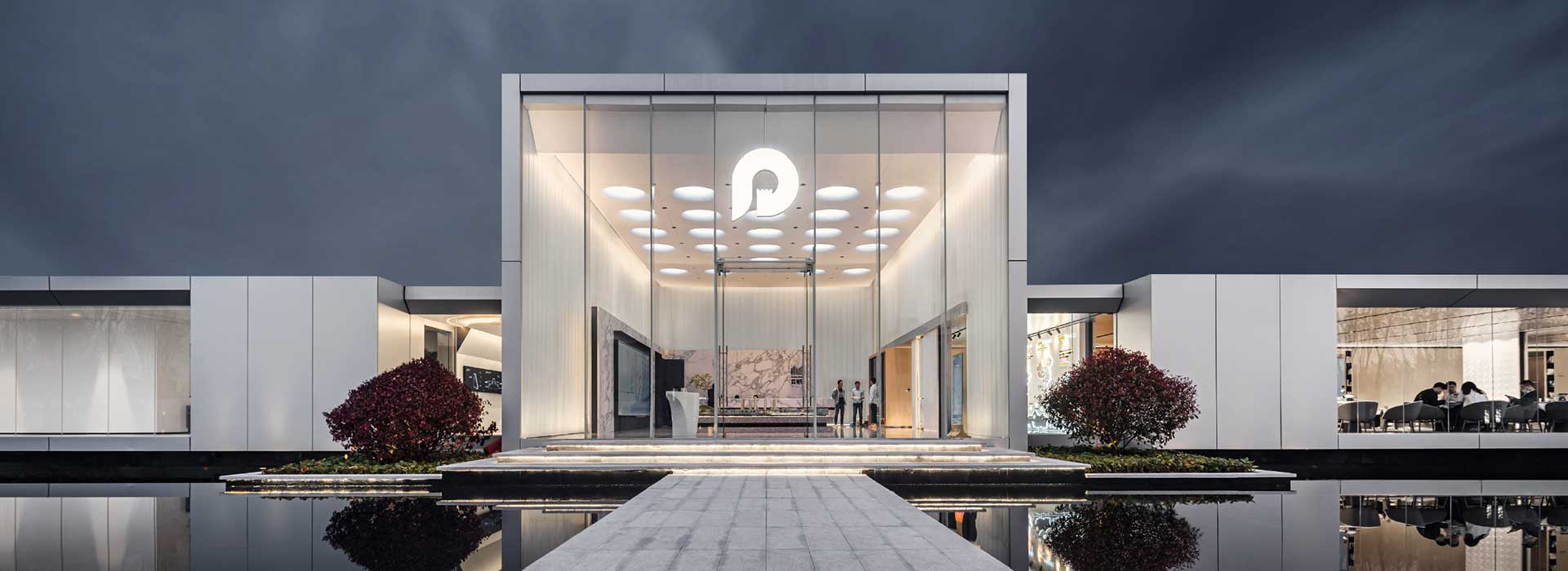 選用銀色金屬板和大面積的玻璃相互組合,采用比例適當(dāng)?shù)姆指睿屨麄€(gè)售樓處顯得通透大氣,室內(nèi)的氛圍感透過玻璃和水面的折射彌散至室外,讓室內(nèi)外更好的融合在一起。