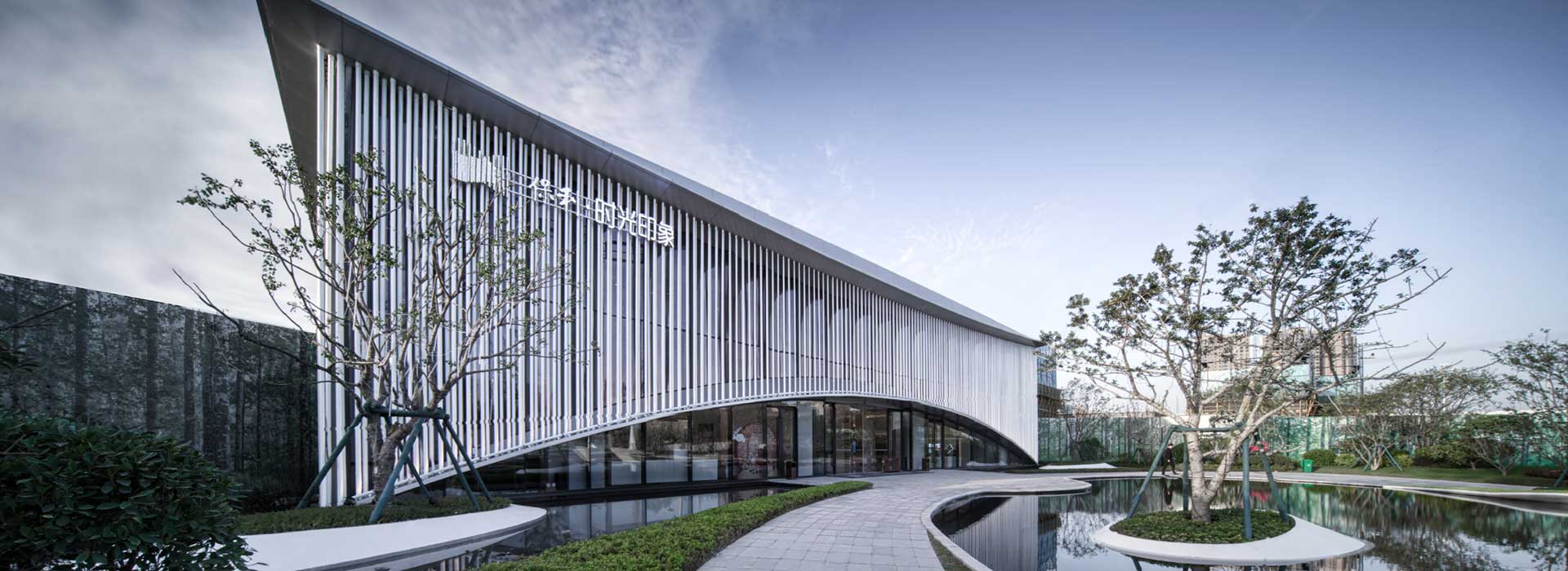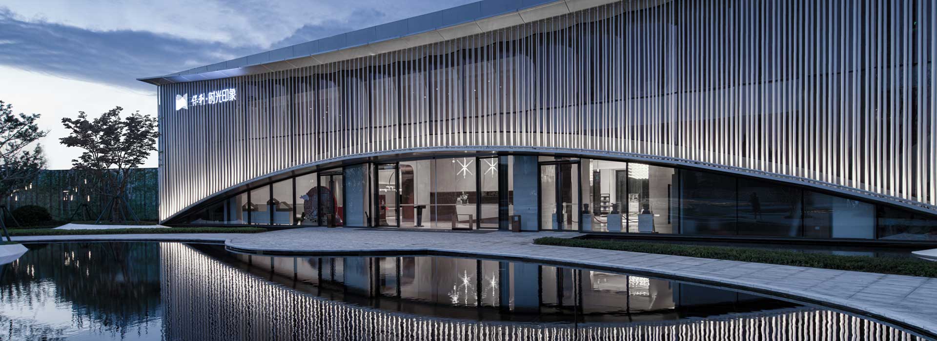 售樓處以簡潔優(yōu)雅的形體配以流動(dòng)的幕墻,形成輕盈、優(yōu)美的造型。流動(dòng)的幕墻如海絲之路的水波,弧形入口在鏡面水景的倒影下,猶如一輪旭日莊嚴(yán)地從水波漣漣、亮光熠熠的海面上升起,寓意“日出東方”。金色的豎向線條,猶如翻滾的波浪,名為“海絲之路”的畫卷就此展開。