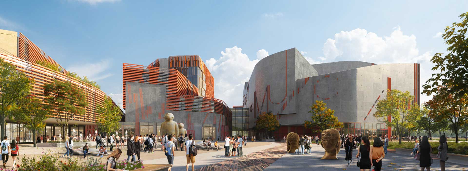 深圳作為一個(gè)具有開(kāi)放性與藝術(shù)包容性的城市,在國(guó)際化教育水平及經(jīng)濟(jì)發(fā)展中都有著不可估量的重要性。深圳音樂(lè)學(xué)院位于深圳龍崗國(guó)際大學(xué)園區(qū)的中心地理位置,成為通往大學(xué)社區(qū)的門(mén)戶(hù)。在設(shè)計(jì)中融合了城市獨(dú)有的“開(kāi)放性”理念,以充滿(mǎn)活力、友好、靈動(dòng)的布局作為整體規(guī)劃的主要方向,通過(guò)散落性的點(diǎn)狀布局,將建筑與周邊自然環(huán)境相融合,形成富有變化的、靈活的學(xué)??臻g與開(kāi)放姿態(tài)。