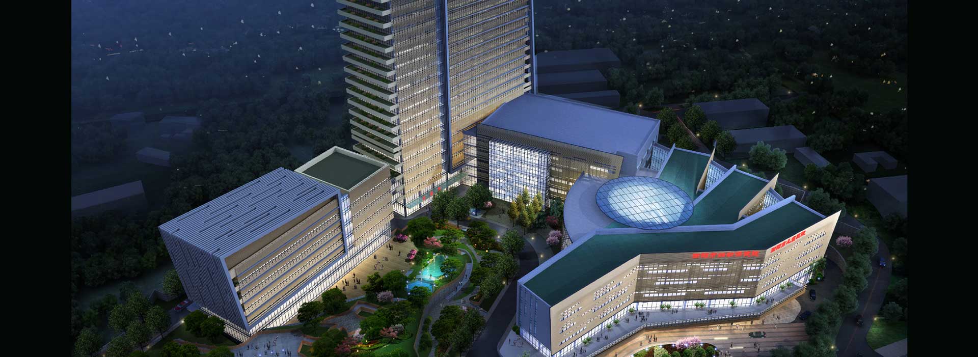 項目基地位于交通方便的衡州大道的北側(cè),基地地形標高高于衡州大道;同時內(nèi)含有綠化山體、假山及地形高差的特征;基地東、西兩側(cè)亦略高于基地標高,故在基地內(nèi)的500床位規(guī)模醫(yī)療建筑群的設(shè)計采取依地勢而建的構(gòu)思,將門急診部設(shè)在面對與衡州大道同一標高的綠化入口廣場上,為一組4層樓的裙房;醫(yī)技樓則設(shè)在門急診樓與住院樓之間,為門急診、住院病人資源共享,呈5層樓裙房布局;住院部坐北朝南計19層與醫(yī)技群房相連,面對衡州大道,依據(jù)基地地形由低至高的態(tài)勢呈現(xiàn)出高低錯落、逐步升高的極具活潑、優(yōu)美的建筑群體組合。