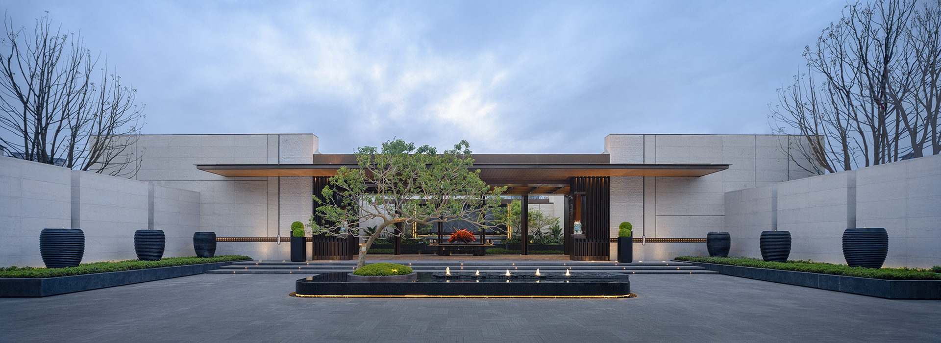 在項目整體打造的概念上將規(guī)劃市政路作為前區(qū)引導(dǎo)空間,把市政公園一并納入展示區(qū)打造范圍,醞釀曲徑通幽與豁然開朗的氛圍感。多感官研究視角的引入成為設(shè)計立意與手法,是模擬自然的形態(tài)與沉浸其中的身體感受,通過橫向片墻與縱向片墻的高差起伏,圍合出“園”的空間意向,空間體驗舒適而自然。